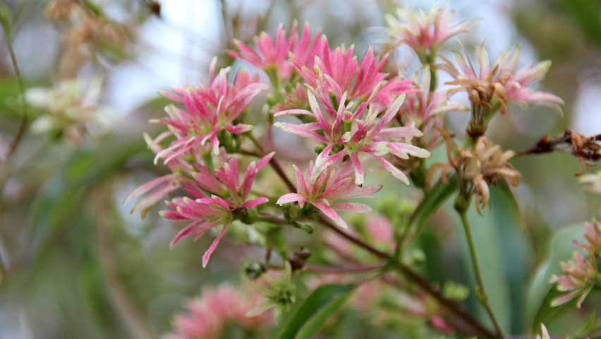 5. De zevenzonenboom, een boom die verschillende sierwaardes heeft! In de winter valt deze boom op door de prachtige afbladderende stam. Dan, als het voorjaar wordt kom er leuk ovaalachtig blad in de boom, wat ook mooi afsteekt tegen de stam! Rond eind juni, begin juli komen de eerste bloemknoppen in de boom, en hieraan merkt u dat deze boom niet zomaar een sierboom is. Gedurende de juli en augustus ontwikkelen de knoppen zich. En dan in september, als bijna alle andere bomen uitgebloeid zijn, dan barsten de knoppen open, en zit de hele boom vol met prachtige witte bloemen. Een oase voor bijen, hommels en andere insecten! De witte bloei duurt tot eind september, maar zelfs dan is het nog niet over! De witte bloemen kleuren rood, en kunnen wel tot november in de boom blijven hangen! Deze boom wordt zo’n 4-7 meter lang uiteindelijk.