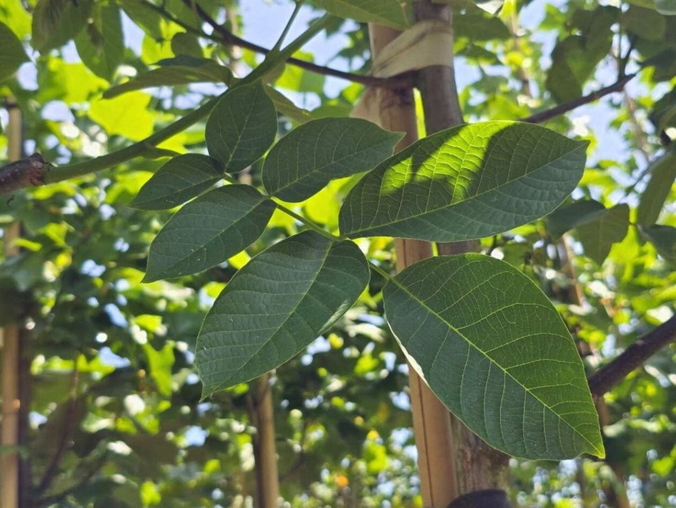 De Juglans regia Meerstammig, ook wel bekend als de Gewone Walnoot. Deze boom staat bekend om de heerlijke walnoten. De bladeren van de Juglans regia zijn geveerd en groen, en in de herfst verkleuren ze naar een gele tint.