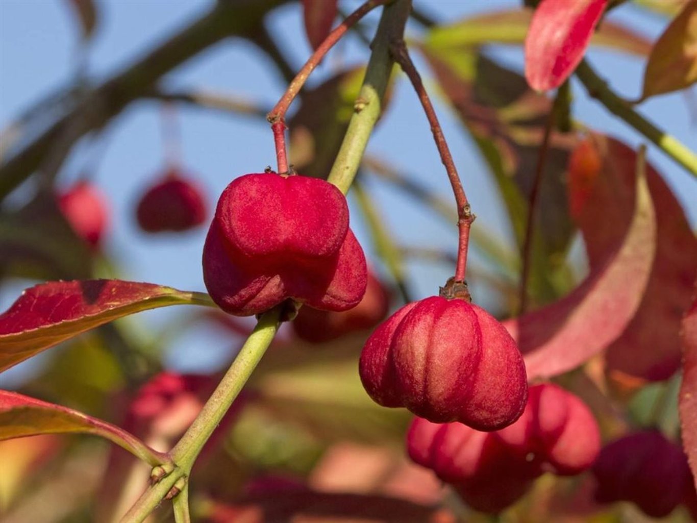 De Euonymus phellomanus in boomvorm is een bijzondere en sierlijke verschijning. De Nederlandse naam is de Kardinaalshoed. In de zomer draagt hij frisgroene, ovale bladeren, maar in de herfst verandert hij in een echte blikvanger met rood/oranje kleur. De boom krijgt in het voorjaar onopvallende, groenwitte bloemetjes en later roze vruchtjes.