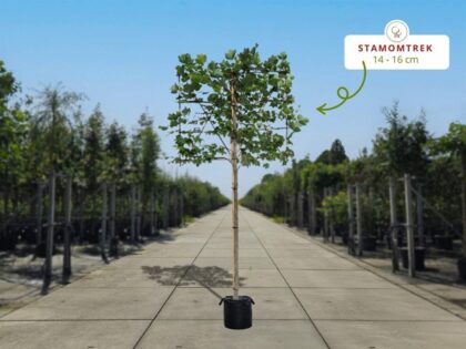 Deze Leiplataan is van de variant Platanus orientalis ‘Digitata’. Ook wel de Oosterse Plataan genoemd. De bast is geel en de groengrijze schors bladdert af waardoor de stam vlekkerig wordt. Het blad ziet er decoratief uit. De randen zijn scherp getand. De boom krijgt net als de gewone plataan stekelige bruine balletjes. Die blijven tot lang in de winter hangen. Kan tegen alle grondsoorten.