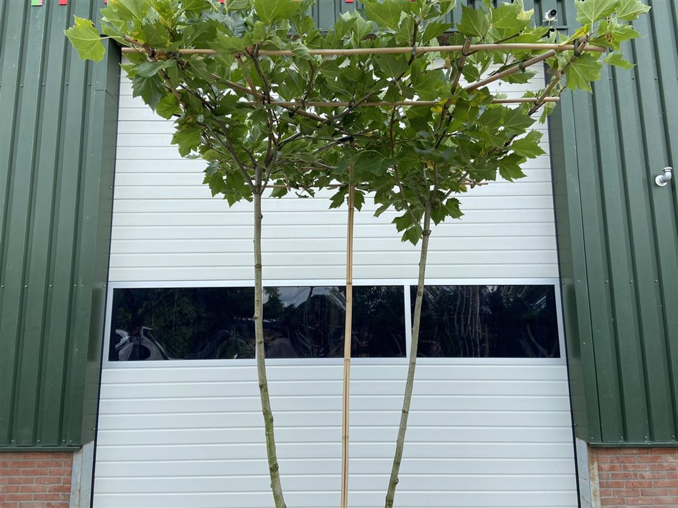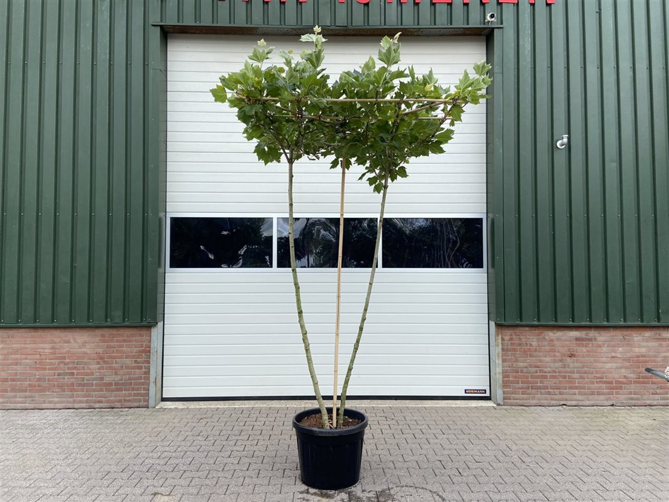 De Platanus hispanica, ook wel de Plataan genoemd, in de vorm van een meerstammige dakvorm. Vanaf de grond lopen er meerdere stammen omhoog naar een dak op ongeveer 230 cm stamhoogte. Het is een snelgroeiend soort. De boom krijgt groot groen blad. De bast gaat in de loop van jaren schilferen, wat een mooi effect geeft.