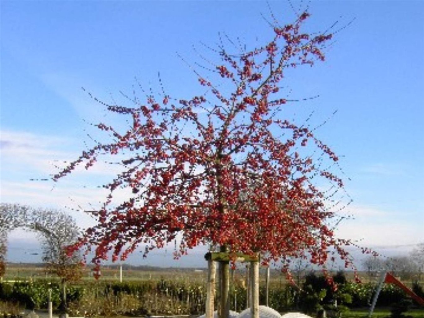 De Malus red sentinel is een van de meest decoratieve wilde appelbomen. De Malus red sentinel is een bijzonder aantrekkelijke en vruchtbare wilde appelsoort. Deze rode sierappel is een krachtige, kleine loofboom en een ideaal exemplaar om de ster te zijn van je tuin in wintertijd. De boom kenmerkt zich door zijn rechtopstaande fiere groeiwijze, goed spreidende vertakte top met groene bladeren die zich in de herfst ontwikkelen met rode tinten. Deze decoratieve wilde appelboom ontpopt zich met roze-witte bloemen in het late voorjaar. Gevolgd door massa’s glanzend mooi rond- rood fruit in de wintermaanden. De vruchten blijven in de herfst en winter lang aan de takken zitten, aangevuld door de herfsttinten van de bladeren voordat ze vallen.