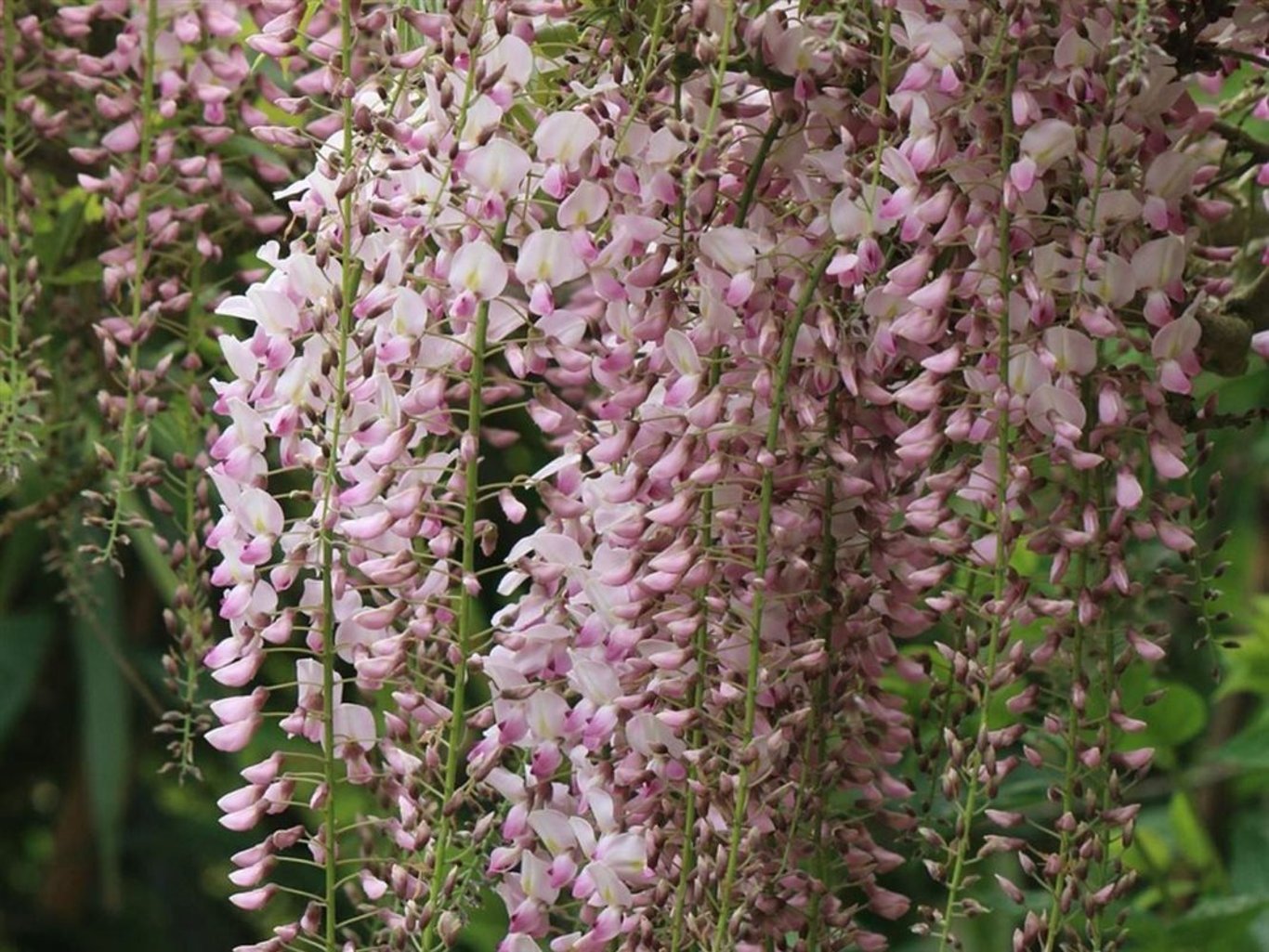 De bloei van Wisteria floribunda ‘Rosea’ vindt plaats in het late voorjaar, meestal in mei en juni. De bloemen hangen in lange, slingerende trossen tot 30 centimeter en verspreiden een lichte geur die bijen en vlinders aantrekt. Deze bloemtrossen hebben een mooie roze kleur.