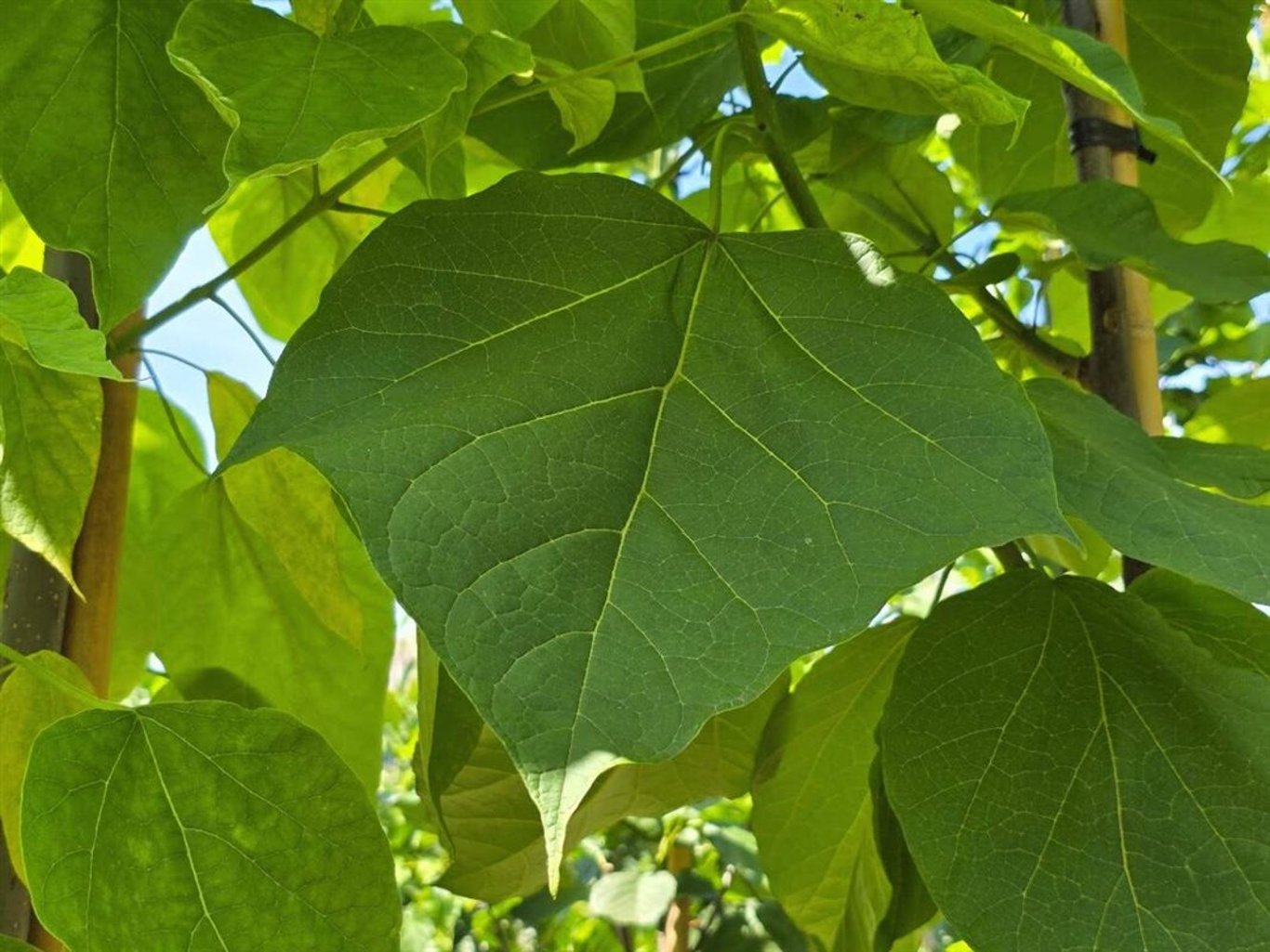 Kenmerken van de Trompetboom Catalpa Bignonioides : De trompetboom is een bladverliezende boom die bekend staat om zijn grote, hartvormige bladeren en opvallende witte bloemen met gele en paarse markeringen. Hij produceert ook lange, smalle peulen na de bloei. De boom kan een aanzienlijke hoogte bereiken, meestal tussen de 9 en 18 meter, en heeft een spreidende kroon.