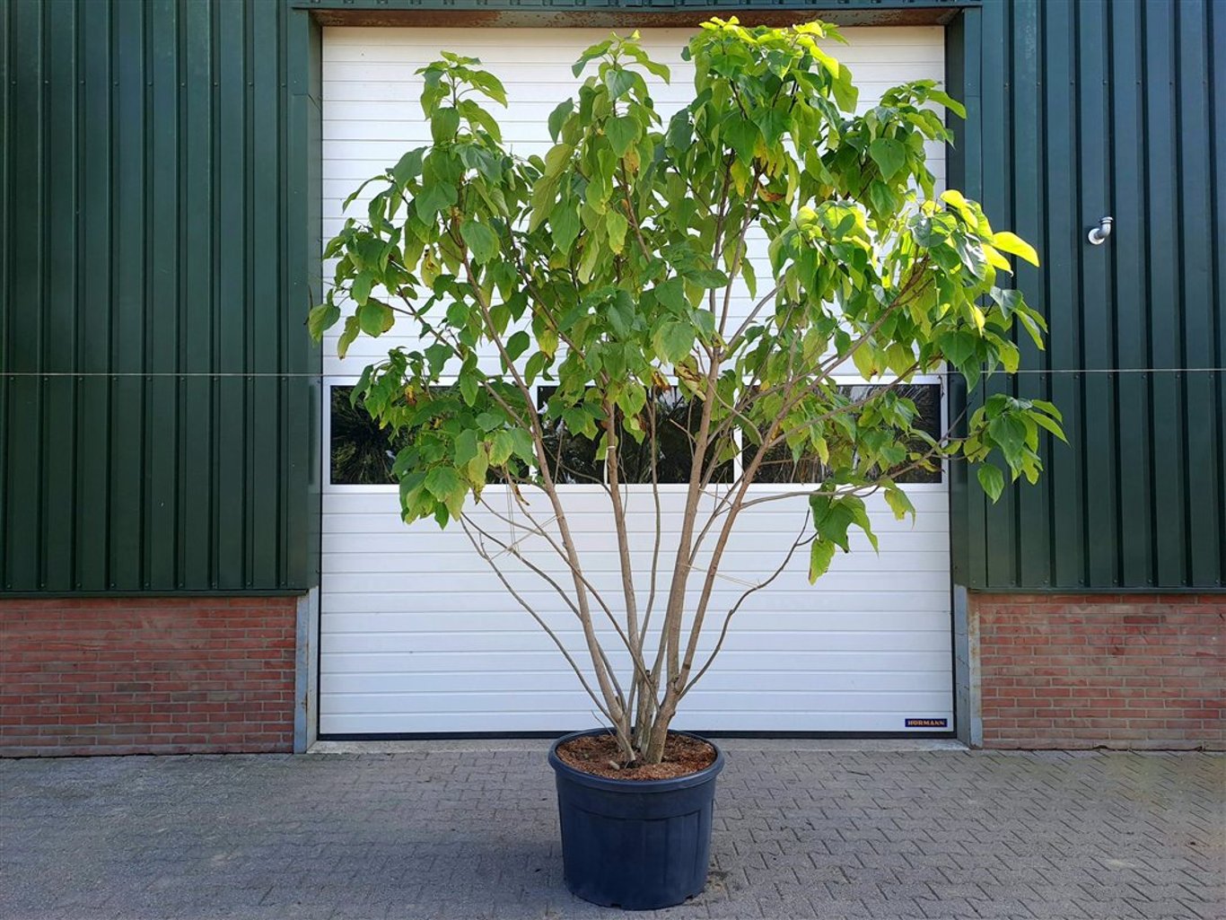 De Trompetboom Catalpa Bignonioides is een mooie snelgroeiende meerstammige struik. De trompetboom heeft een rond halfopen kroon die grillig groeit. Dit betekend dat er niet echt een terugkerend patroon in de kroon te herkennen is. In mei, juni en juli bloeit deze boom met schitterende 25 centimeter lange witte pluimen. Het blad van de trompetboom loopt relatief laat uit. Deze meerstammige struik heeft grijze ondiep gegroefde schors en takken. De catalpa bignonioides heeft geen stekels, doorns en is zoals de meeste bomen uiteraard niet giftig. De trompetboom heeft geringe bodemeisen maar kan niet overleven op een natte bodem. De trompetboom is een echte drachtboom voor bijen en een waardboom voor vlinders. Dit betekend dat zowel vlinders als bijen door de boom worden aangetrokken.